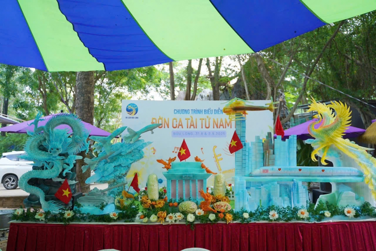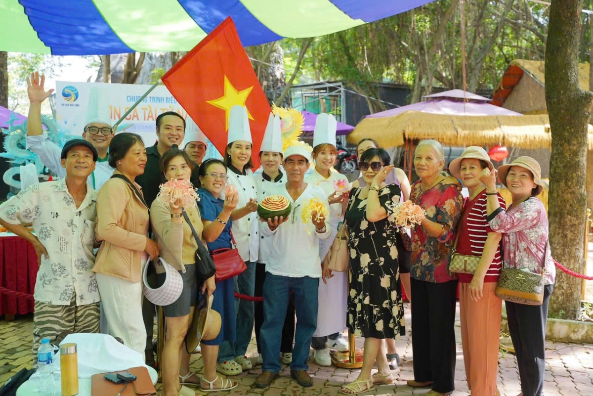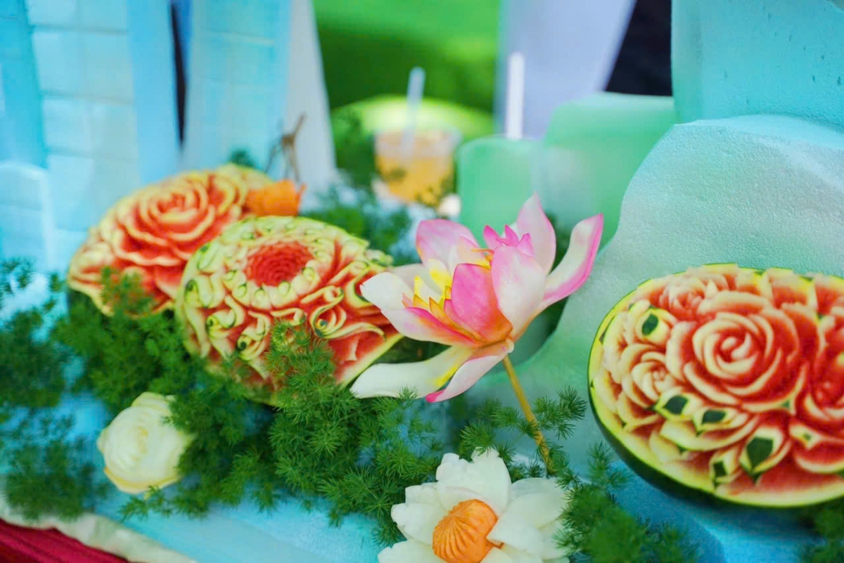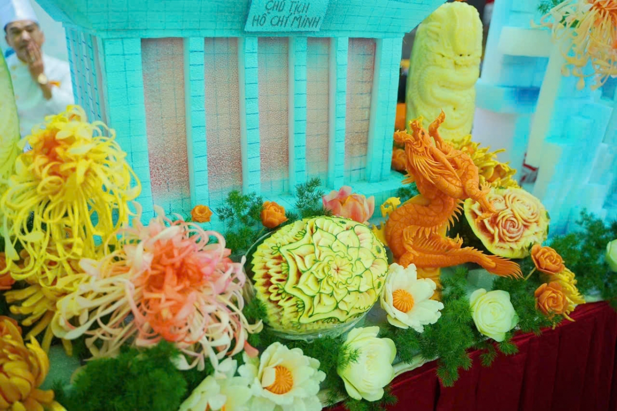 🥕🍉 Từ các loại củ quả như cà rốt, dưa hấu, củ cải... 50 nghệ nhân đến từ Hội đầu bếp Đồng Nai đã cùng nhau cắt tỉa và sáng tạo mô hình "Rạng rỡ Việt Nam" với hình ảnh của các biểu tượng như Lăng Bác, Tuyến Metro số 1, Máy bay cất cánh, Xe tăng...